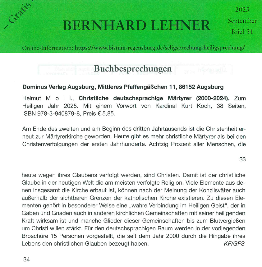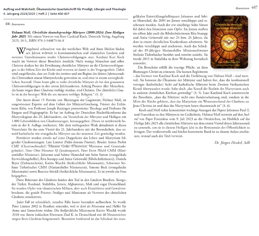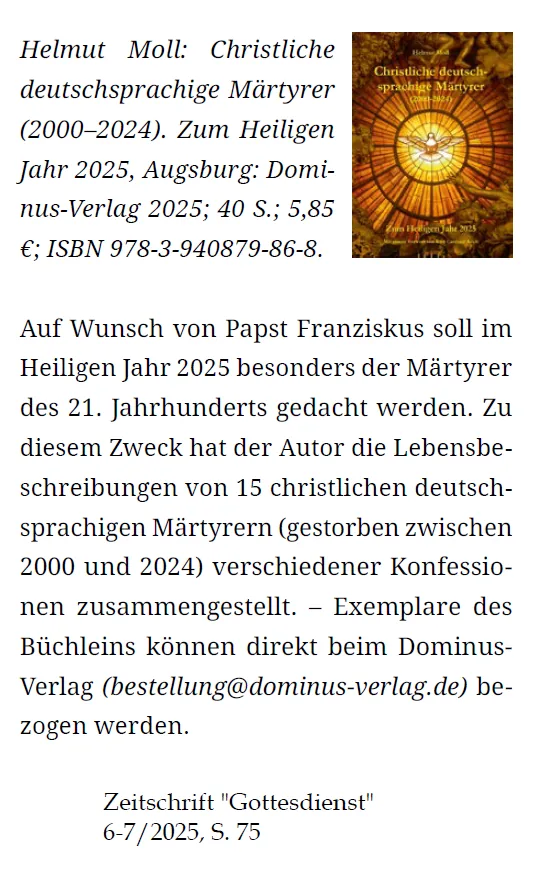 Der Autor ist ausgewiesener Experte auf dem Gebiet der Märtyrerforschung. Helmut Moll, Priester des Erzbistums Köln, von Prof. Joseph Ratzinger promovierter Theologe und Professor für Exegese und Hagiographie, hat im Auftrag der Deutschen Bischofskonferenz das Martyrologium des 20. Jahrhunderts, ein Verzeichnis der Märtyrer und Heiligen, das 1.000 Lebensbilder von Glaubenszeugen enthält, herausgegeben. Dieses ist mittlerweile bereits in der 8. Auflage erschienen. Mit dem vorliegenden Werk aktualisiert er dieses Verzeichnis für das erste Viertel des 21. Jahrhunderts mit der Besonderheit, dass sowohl katholische wie evangelische Märtyrer aus der neuesten Zeit gewürdigt werden.